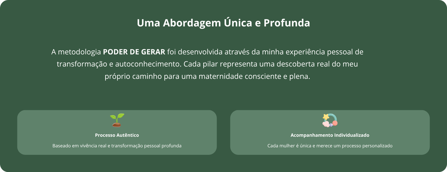 Ajudamos mulheres a realizarem o sonho da maternidade através do autoconhecimento profundo e metodologia especializada.